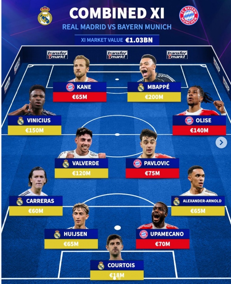 4月7日讯 北京时间明天凌晨,皇马将在欧冠1/4决赛首回合比赛中主场对阵拜仁。德国转会市场列出了皇马+拜仁阵容。